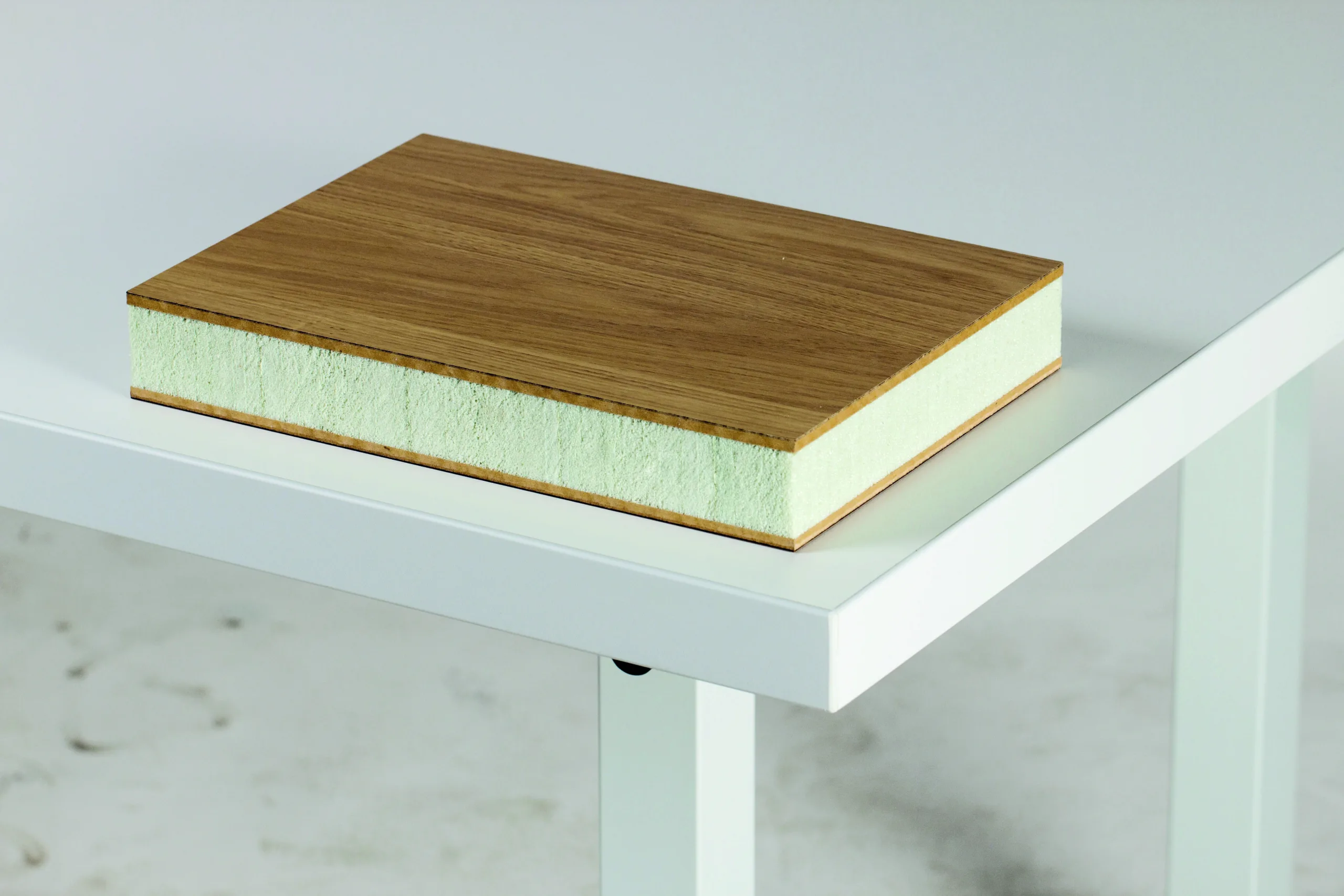Tischplatte 40 mm mit Mittellage aus PET-Hartschaum.